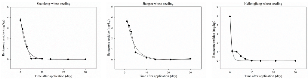 Figure 4. Dissipation of bentazone in wheat plants in Shandong, Jiangsu and Heilongjiang.