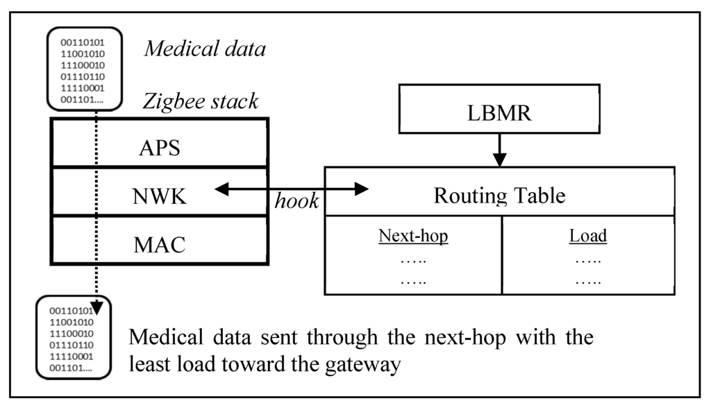 Figure 2. Once a Zigbee router forwards medical data, LBMR guides the Zigbee NWK layer to choose a next-hop with the least load toward the gateway. Besides, LBMR also ensures the next-hop is closer to the gateway than the router itself to prevent routing loops. Therefore, LBMR design can easily cooperate with existing Zigbee stacks.