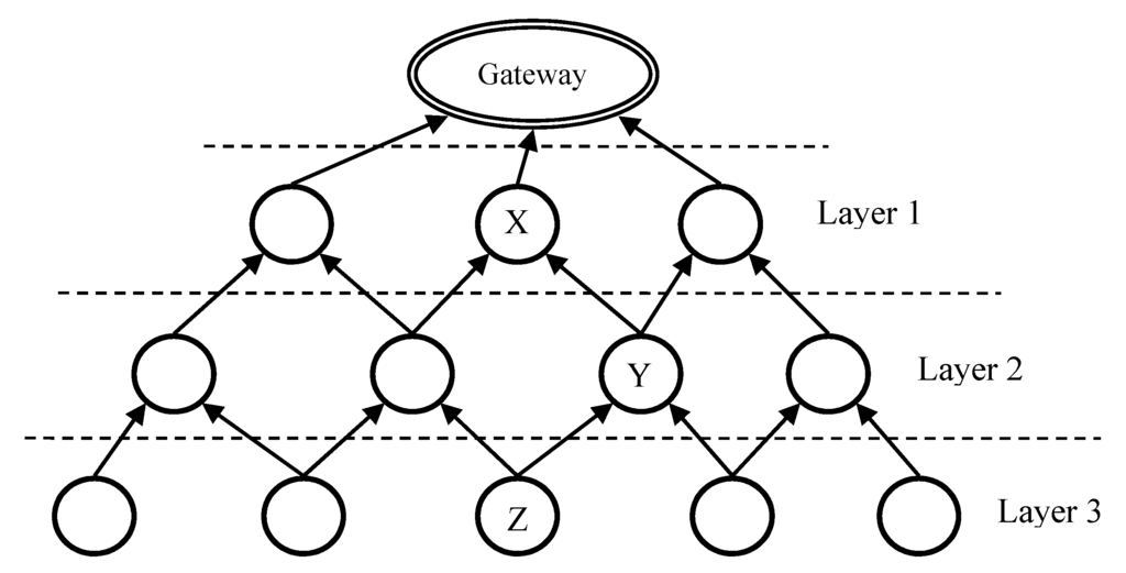vice versa. In LRC, nodes in the upper layers are closer to the gateway than nodes in the lower layers. Each sensor may play both roles of lower-layer and upper-layer nodes in different relationships. For example, the distances to the gateway of three nodes are denoted as X