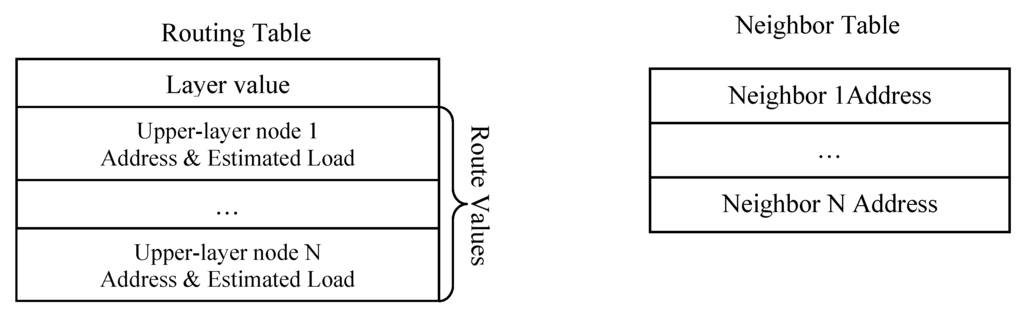 Route values, which has several upper-layer nodes associated with estimated loads. A next hop represents an upper-layer node on the path to the gateway, and estimated load is illustrated in LEA section in the following. Besides Routing Table, another Neighbor Table is used to record available neighbors to the gateway. Routing Table only stores the upper-layer nodes to the gateway, while Neighbor Table stores addresses of all neighboring nodes.