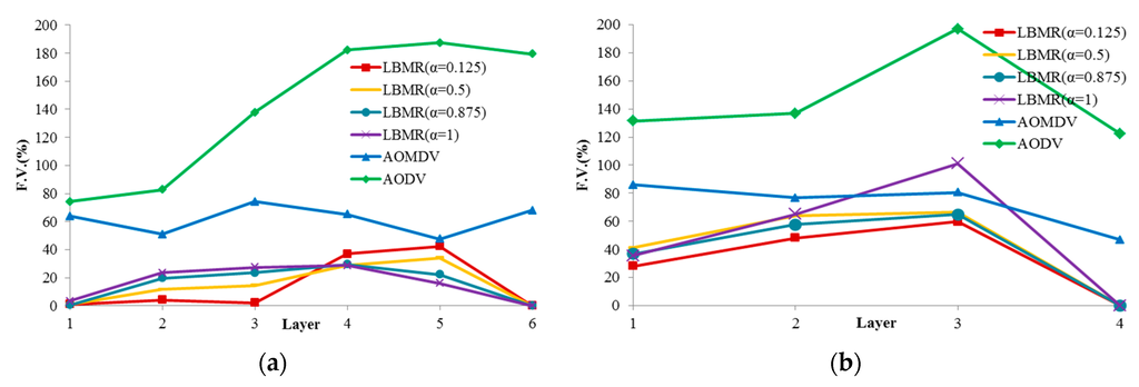 Based on FV, LBMR shows much better performance than AOMDV, especially at Layer 1. In grid topology, FV of LBMR with (α = 0.125) is close to 0 at layer 1, 2, and 3. On the contrary, FV of AOMDV is from 50% to 75%. In random topology, FV of AOMDV is over 80% and FV of LBMR can be 30% at layer 1. In AODV scenarios, FV is above 120% in both topologies. AODV is a single-path routing protocol, in which network traffic is aggregated at certain paths and the bottleneck issue becomes more serious. This explains why the load balancing performance of AODV is the worst among three protocols. FV of AODV in both topologies is much higher than LBMR and AOMDV. Therefore, LBMR shows much better load-balancing performance than both AOMDV and AODV do. Moreover, we can observe LBMR of grid topology has better FV performance than that of random topology. This is because the number of connections of grid topology is fixed and the traffic is easier to be predicted and optimized.