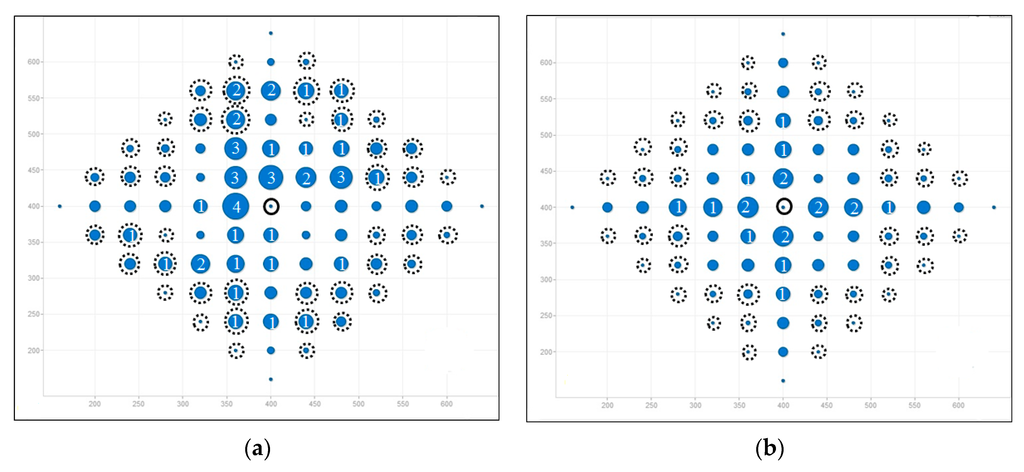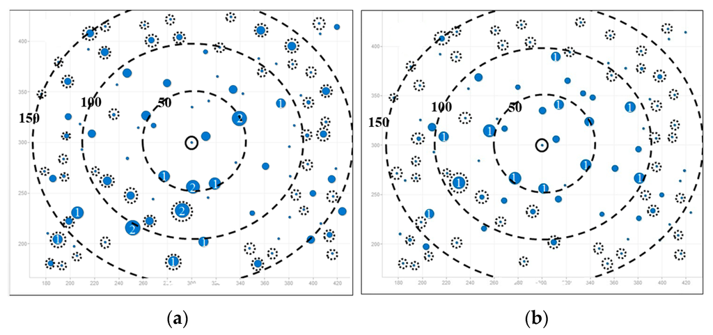 Figure 6a shows AOMDV scenario, where large blue circles surround the gateway and it means imbalanced network traffic is aggregated at some nodes, especially at Layer 1. Therefore, bottlenecks are prone to occur at Layer 1. On the contrary, LBMR in