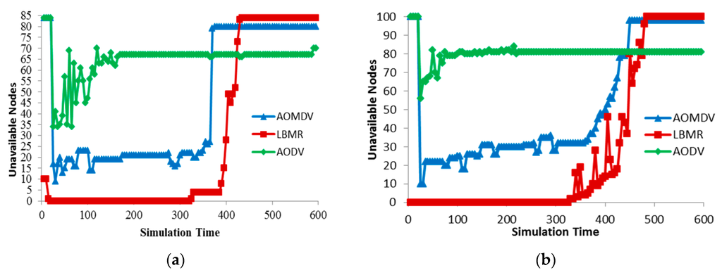 Figure 8a can clearly illustrate route maintenance effort in three protocols. AODV’s URNs quickly increases quickly while AOMDV’s URNs gradually increase. LBMR’s URNs keeps none in the beginning and remains under 20 after node failure occurs. From