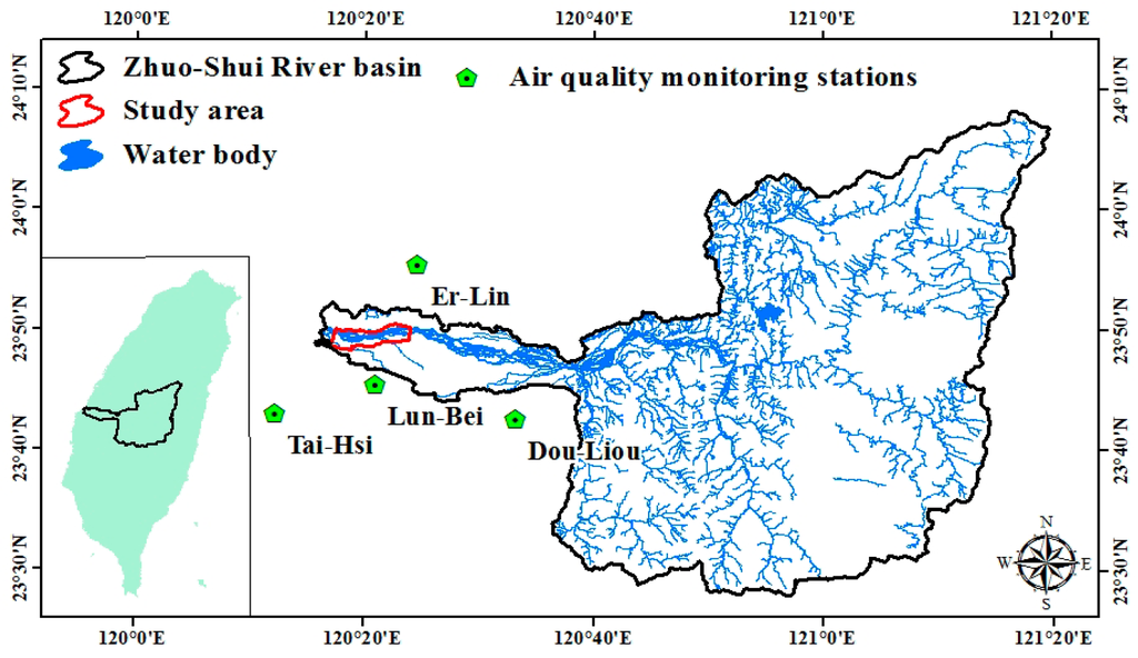One of the PM10 emission sources is aeolian dust, which is associated with the wind erosion of soils [14]. Dust particles originate from several different sources e.g., deserts, coastal areas, agricultural areas, alluvial fans, dry lake beds, and dry river beds [15]. In Taiwan, river dust episodes most frequently occur during the winter when northeastern monsoons are prevalent, and most seriously affect residents and agricultural production near rivers and estuaries [16,17,18,19]. After the last major precipitation event in the fall, low rainfalls during winter droughts cause river waters to recede. As the moisture content of the riverbed soil decreases, the sand, silt, and clay particles that were transported downstream and deposited on the riverbed surface become a primary source of fugitive dust. In addition, transverse structures such as water dams or check dams have been built across the upper reaches of some rivers in Central Taiwan, preventing sizable quantities of water and larger earth and sand particles from moving downstream. This has caused an increase in the area of exposed bare riverbed as well as a decrease in particle diameter distribution, greatly increasing the likelihood of a river dust episode [20]. By processing data from the air quality monitoring station at Lun-Bei, analyzing the chemical composition of the aerosol, and receptor modeling, it was determined that PM10 concentrations at the Lun-Bei station have increased substantially since 2004, and that conditions are worst at the estuary of the Zhuo-Shui River near Lun-Bei. For these reasons, factors that affected river dust emission near the estuary of the Zhuo-Shui River were explored in this study.