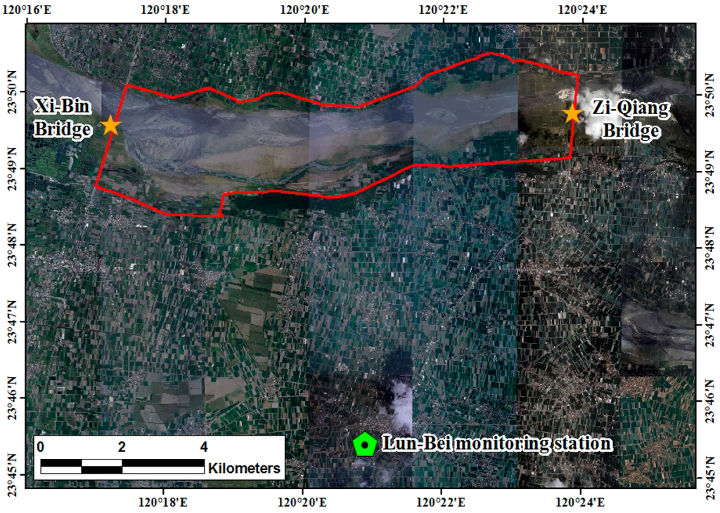 The Zhuo-Shui River is located in central Taiwan. It consists of layers of shale and sandstone that are vulnerable to erosion. It frequently suffers from rain erosion. A large amount of sediment is transported by the stream. All year round it is muddy, which is also the origin of its name. In the outlet of the Zhuo-Shui River, due to congenital conditions, soil particle sizes are extremely small and their binding strengths are weak. The soil is struck by the northeast monsoon every dry season. Thus, the streets on the southern side of the river are dusty and the safety of both lives and property is threatened. Hence, the outlet of the Zhuo-Shui River (where there is potential for dust hazards during the dry seasons) is selected as the study area (Figure 1). Its range is from Zi-Qiang Bridge to Xi-Bin Bridge. Annually, the flooding–receding process occurs during March to October, which is the wet season, whereas the rest of the year is the dry season (Figure 2). The land is used to grow watermelons. The floodplain is dominated by growth wild sugarcane grasses. The areas near the river embankment have been cultivated to grow melons, peanuts, vegetables, and other crops [35].
