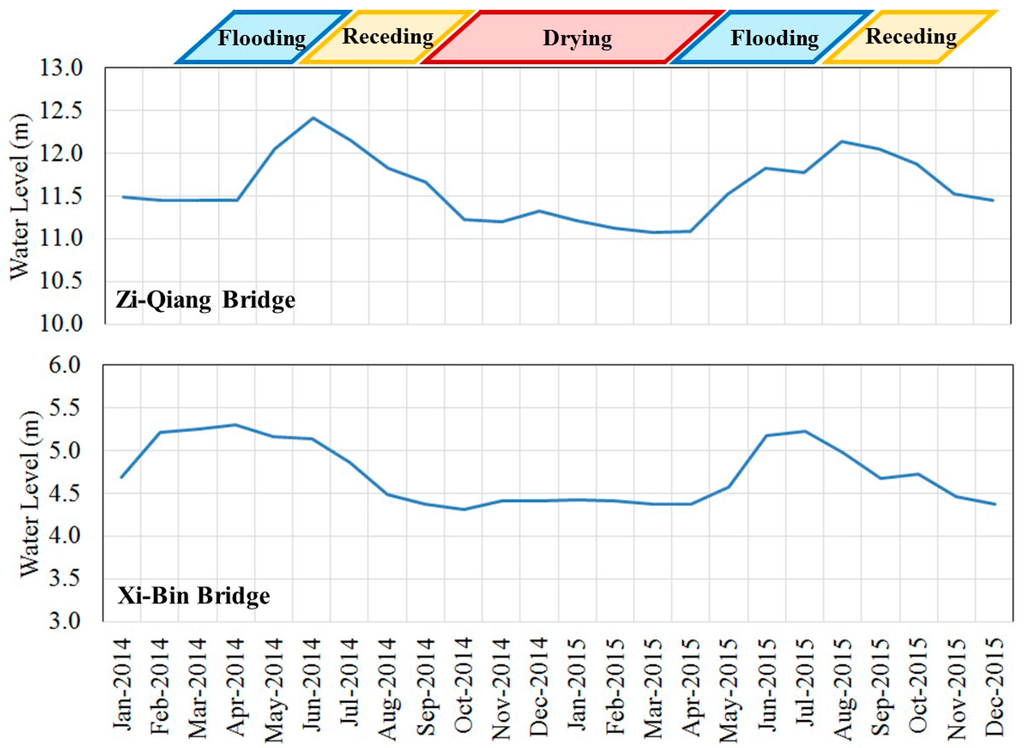 The seasonal variations of water level at Zi-Qiang Bridge and Xi-Bin Bridge.
