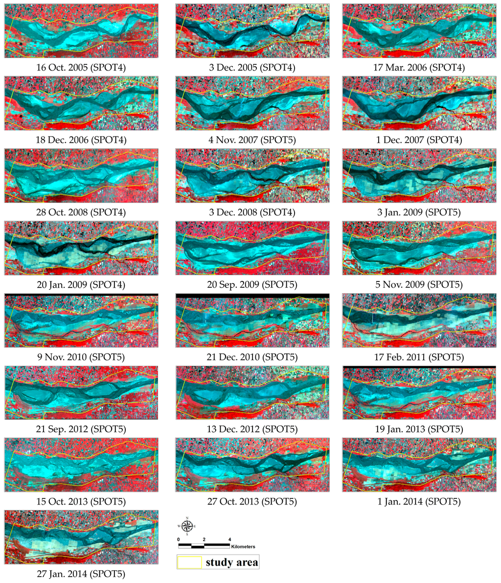 Out of the four air quality monitoring stations around the research area, only the meteorological data of the Lun-Bei monitoring station were selected to construct the model due to its proximity to the southern bank of the river and its location in Lun-Bei village, which is subject to river dust under northeast monsoons. PM10, PM2.5, rainfall, wind velocity, wind direction, temperature, and relative humidity data from 2005 to 2014 were analyzed in this study. For more information regarding the monitoring devices and placement please refer to [36]. The National Central University Center for Space and Remote Sensing Research’s Satellite pour l’observation de la Terre (SPOT) obtained 22 cloud-free SPOT4/5 images (Figure 3) in which land cover data were extracted from those images. In order to reflect the status of land cover for each river dust episode, the date of the image should be selected in proximity to the episode. The date difference between each episode and the corresponding image was limited to be within 15 days of the cloud-free image acquisition.