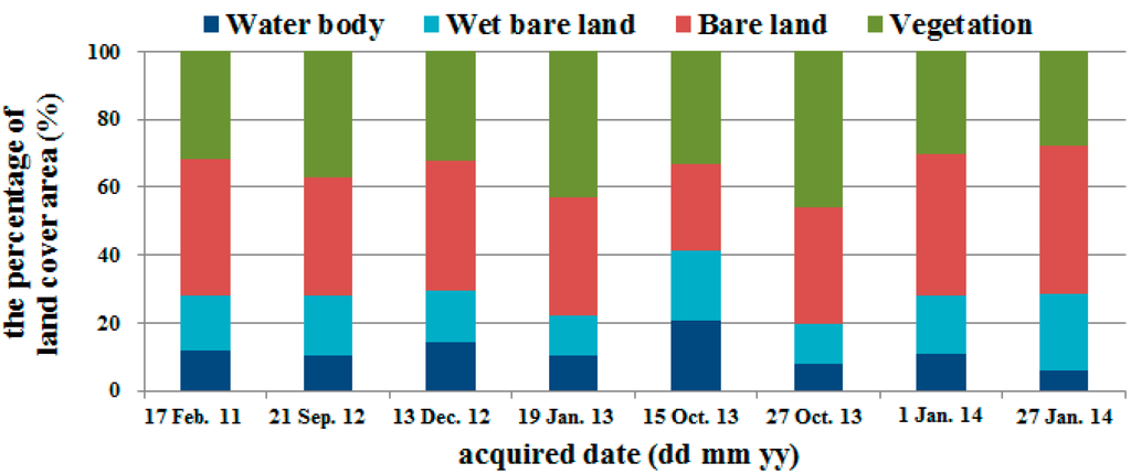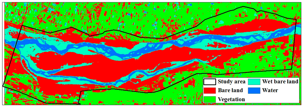 To derive the potential dust emission zones at the estuary of the Zhuo-Shui River, image classification was performed using a supervised classification method and a maximum likelihood algorithm. In a supervised classification scheme, training samples that are representative of the land cover classes of interest should be selected [39]. In this study, four types of land cover (i.e., vegetation, water, wet bare land, and bare land) were selected from the research area at the lower reaches of the river between the dikes from the Zi-Qiang Bridge to the Xi-Bin Bridge (Figure 5 and Figure 6). The probability distribution was calculated using a maximum likelihood algorithm; in particular, a multivariate normal distribution is assumed as the probability density function for each land cover class. Each pixel is then evaluated and assigned to the class that has the highest probability [40].