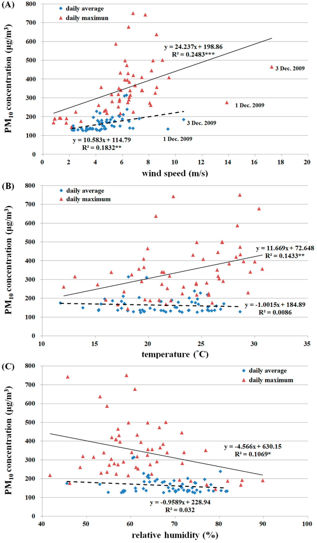 Relationship between daily average/maximum PM10 and (A) wind speed; (B) temperature; and (C) relative humidity. Dashed lines are regression lines of daily average PM10 and bold lines are regression lines of daily maximum PM10.