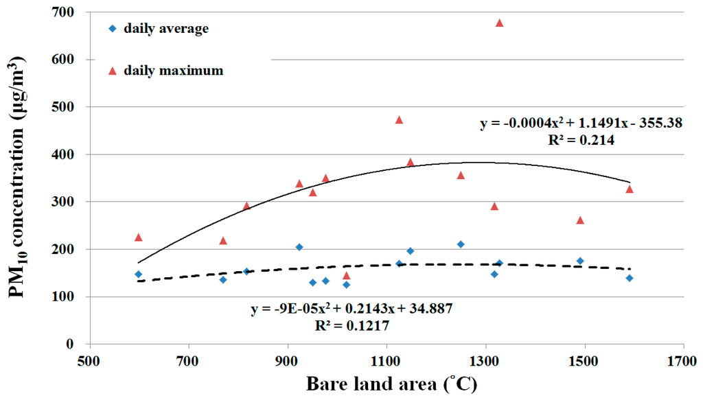 In addition, including the bare land area in the multiple regression analysis showed that all factors for predicting daily average PM10 were excluded by the stepwise analysis process. For predicting the daily maximum PM10, the coefficient of determination was as high as 0.67. Therefore, bare land area was the key factor affecting PM10 concentration.