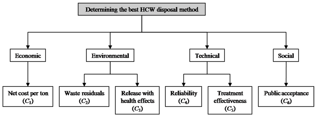 With the rising awareness of the environmental implications of waste disposal, the management and treatment of health-care wastes (HCWs) are gaining more attention all around the world [1,2,3,4]. HCW that is improper handled and disposed of may cause environmental pollution and health problems in terms of proliferation of diseases caused by viruses and micro-organisms, as well as contamination of ground water by untreated medical waste in landfills [5,6]. The HCW management is especially important in developing nations due to conspicuously inappropriate disposal methods, and insufficient financing and infrastructural challenges [7,8,9]. The HCW is defined as all waste materials generated by health care facilities, such as hospitals, clinics, private surgeries, diagnostic centers, dental practices, blood banks, as well as research facilities and laboratories [5,10]. It includes sharps, human tissue, body parts, diagnostic samples, blood, chemicals, pharmaceuticals, medical devices and radioactive materials [10,11]. To avoid human health and environmental issues accompanying poor management of the HCW, both governments and scholars search for effective waste treatment strategies and solutions. Further on, the problems associated with treatment of HCWs should be solved in a manner that minimizes the risks to the public health and human well-being, and the damage to the environment. Therefore, the development of logical and systematic scientific methods is essential to assist urban decision makers in prioritizing and selecting an optimized HCW treatment technology.