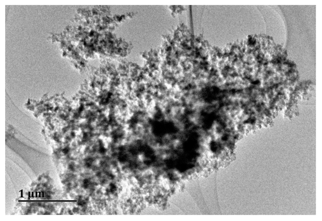 Transmission electron mocroscopy (TEM) image of nano-Al2O3 in the exposure solution. Nano-Al2O3 was agglomerated to large particles (about 1000–3000 nm).
