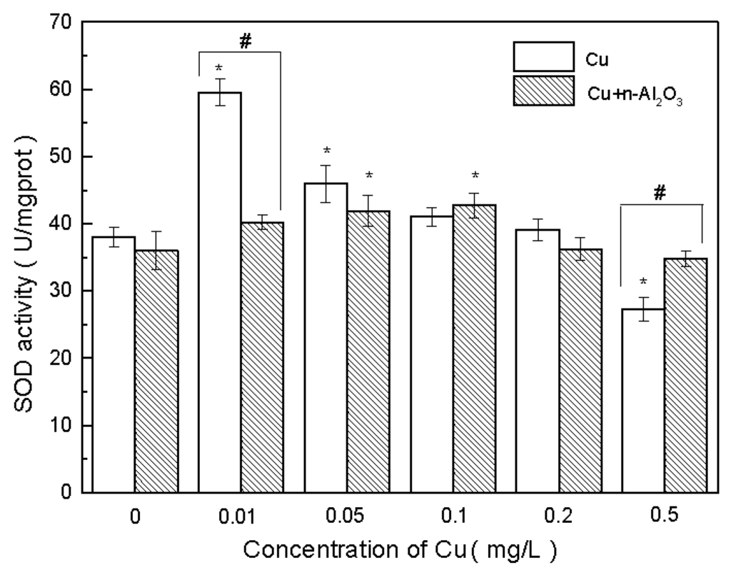 The exposure of Cu resulted in the accumulation of Cu in S. obliquus and the toxicity of Cu to algae can be partly related to the generation of free radicals and subsequent oxidative stress [63,64]. The results showed that when Cu concentration was low, SOD activity was enhanced while GSH concentration decreased. Hence, SOD served as the main free radical remover in this situation. When Cu concentration increased, SOD activity was inhibited while GSH concentration increased. GSH was the main free radical scavenger in this situation. However, when the stress of copper exceeded the self-protection capacity of cells, the excessive free radicals could not be removed in time [65]. This was the reason behind the occurrence of membrane lipid peroxidation, as indicated by the MDA level. However, the MDA concentration was low, indicating low membrane lipid peroxidation. Hence, the existence of nano-Al2O3 might not change the mechanism of copper toxicity; however, it decreased copper accumulation in algae and further decreased the toxicity of copper.