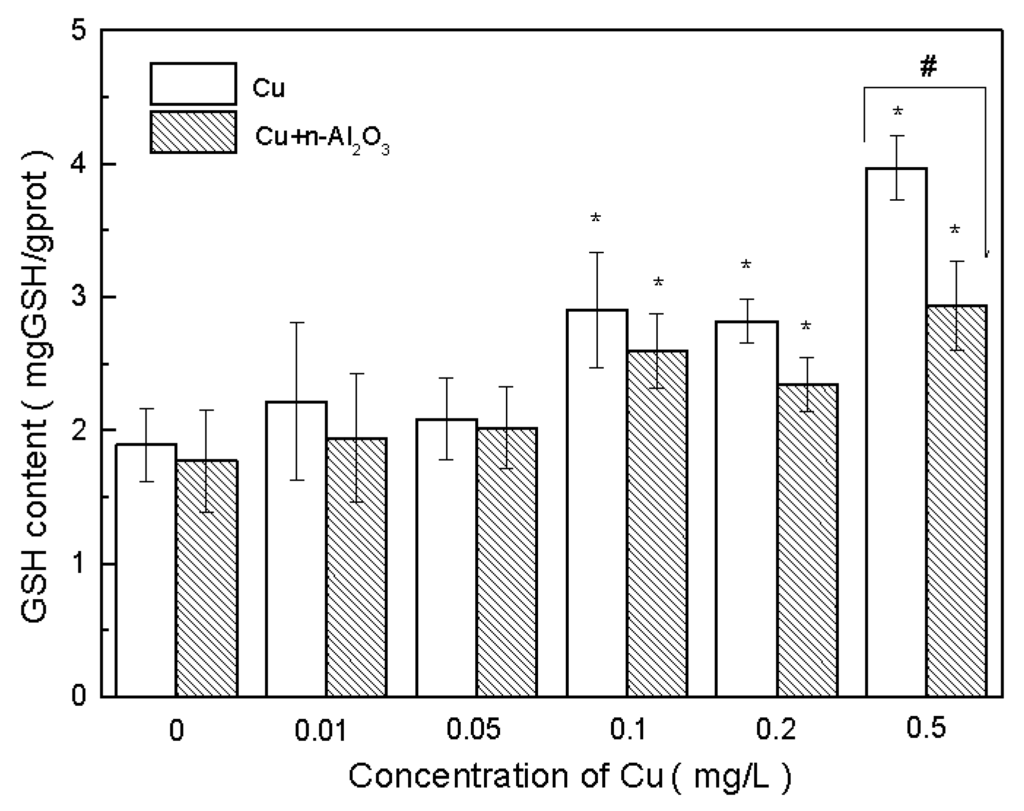Reduced glutathione (GSH) concentrations in S. obliquus exposed to copper and copper/nano-Al2O3 systems at different concentrations of copper after 72 h. Data are mean ± SD (n = 3). Asterisks indicate the significance of differences (p < 0.05) between the control and the exposed treatments. Pound signs indicate the significance of differences (p < 0.05) between the copper system and the copper/nano-Al2O3 system at the same concentration of copper.