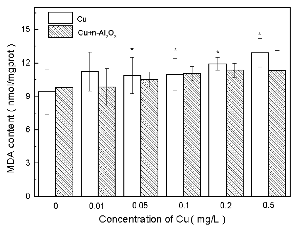 MDA is another biomarker of free radical damage—one that serves as an indicator of cell membrane damage [57]. The change in MDA concentration during exposure is shown in Figure 5. As can be seen, an amount of 1.0 mg/L nano-Al2O3 did not exert a significant influence on MDA concentration (p > 0.5, ES = 0.4). Moreover, no obvious differences were observed at different concentrations compared with the control in copper/nano-Al2O3-exposed treatments (p > 0.05, ES > 0.8). However, with the increase in copper concentration, MDA concentration also increased in both exposure systems.