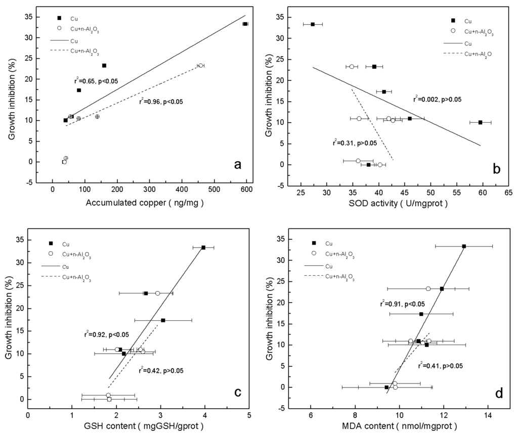 Correlation between growth inhibition and (a) accumulated Cu; (b) SOD activity; (c) GSH concentration and (d) MDA concentration (mean ± SD) in S. obliquus exposed to copper and copper/nano-Al2O3 systems at different concentrations of copper after 72 h.