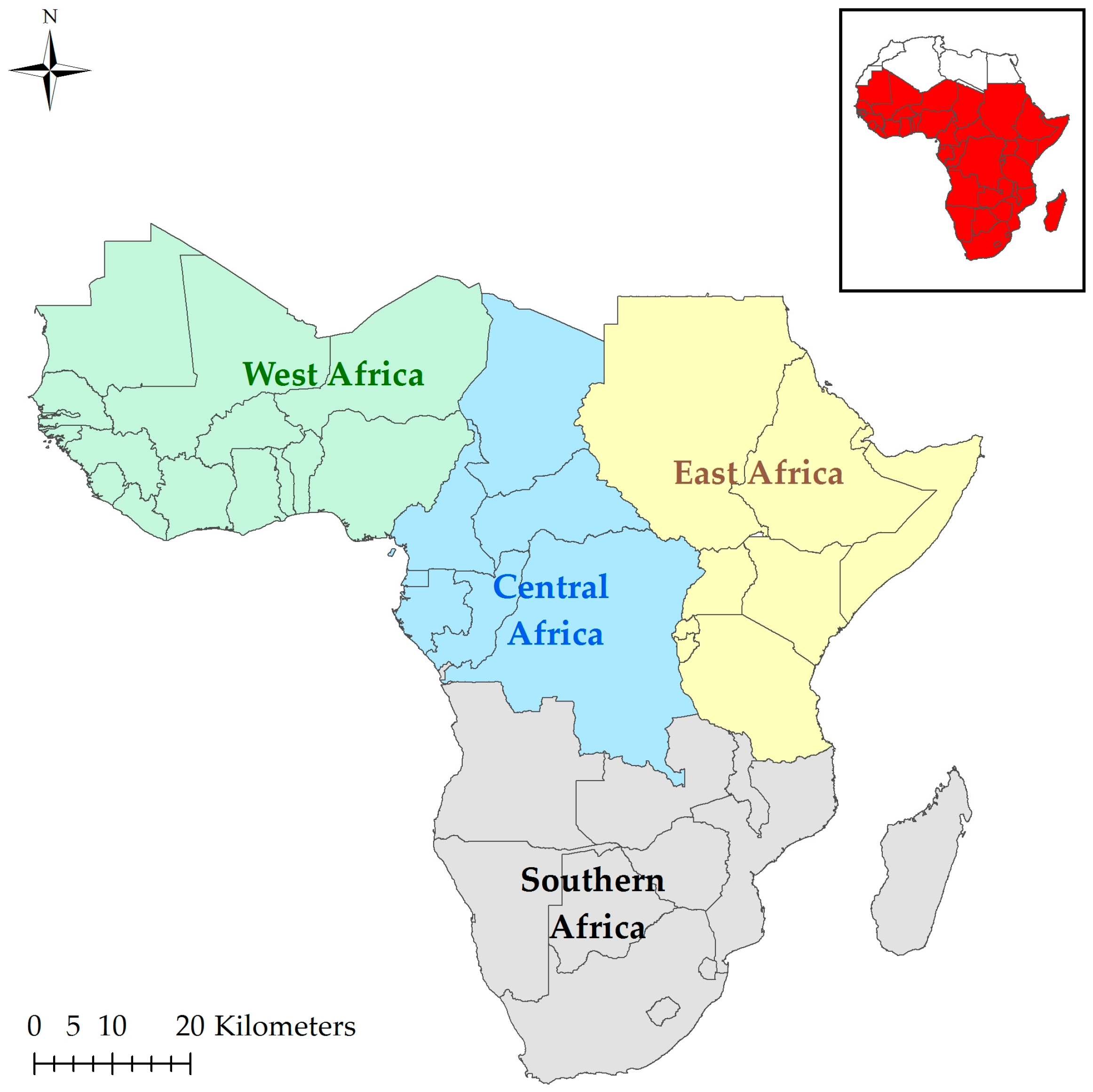 SSA can be sub-divided into four regions (East, West, Central and Southern Africa) as shown in Figure 2. Malaria is endemic in a substantial part of SSA where the climate supports 20%–100% suitability (Figure 3) [34]. At the fringes of this region, there are areas where malaria rarely occurs because the climate is not always suitable. Nevertheless, variation in weather or climatic conditions could instigate an epidemic. The changes in climatic conditions are normally due to higher than normal rainfall and temperature in desert and highland fringes, respectively [34,35].