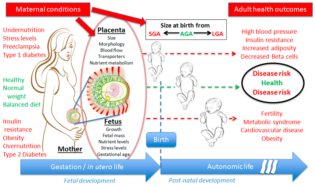 It is now well-established from epidemiological studies that both early nutrition and maternal metabolic status during pregnancy play a seminal role in determining the offspring’s long-term health and metabolism. These maternal conditions affect the growth trajectory and the function of the feto-placental unit, leading to various birth sizes from small (SGA) to large for gestational age (LGA), correlated to different adverse health outcomes at adulthood (Figure 1).