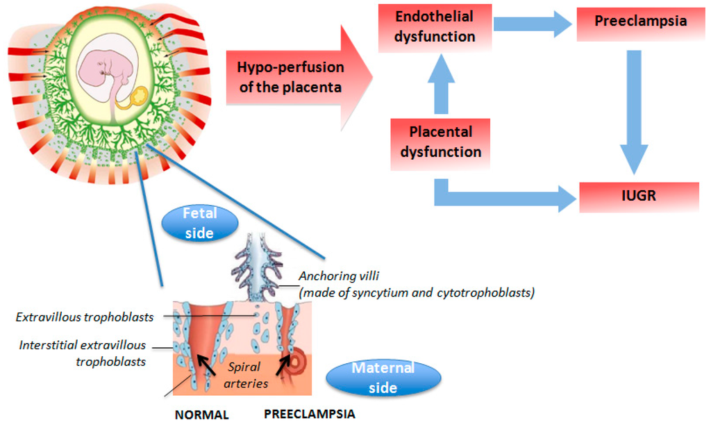Schematic representation of materno-fetal vascularization in human normal pregnancy or preeclampsia conditions leading to intrauterine growth retardation (IUGR).