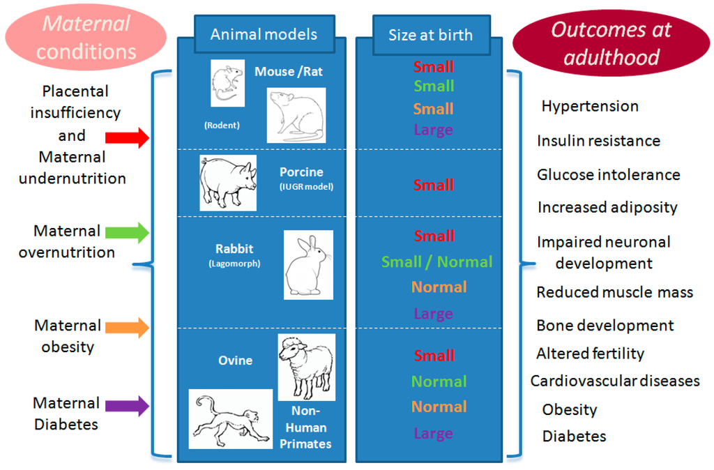 Through animal models, we can observe the subsequent long-term phenotypes of offspring (physiological, cardio-metabolic and behavioral characteristics) and explain the molecular mechanisms by transversal and multidisciplinary approaches. The most common species used in this field are rodents, as well as rabbits (lagomorphs), sheep, pigs and non-human primates, depending on the experimental approaches and tools used to observe in offspring the effects of maternal conditions.