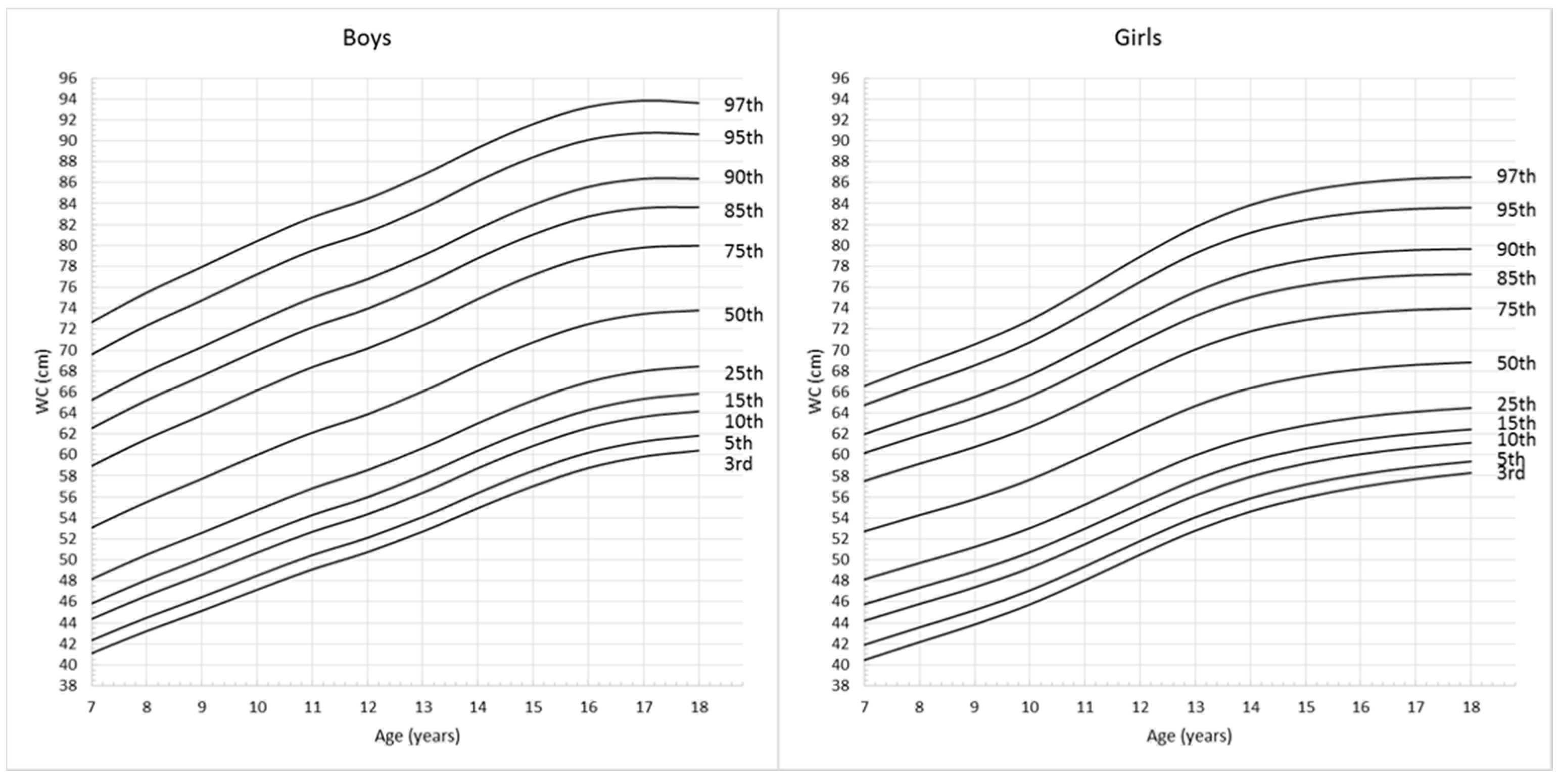 Gender- and age- specific WC percentile curves for Chinese children and adolescents aged 7–18 years.