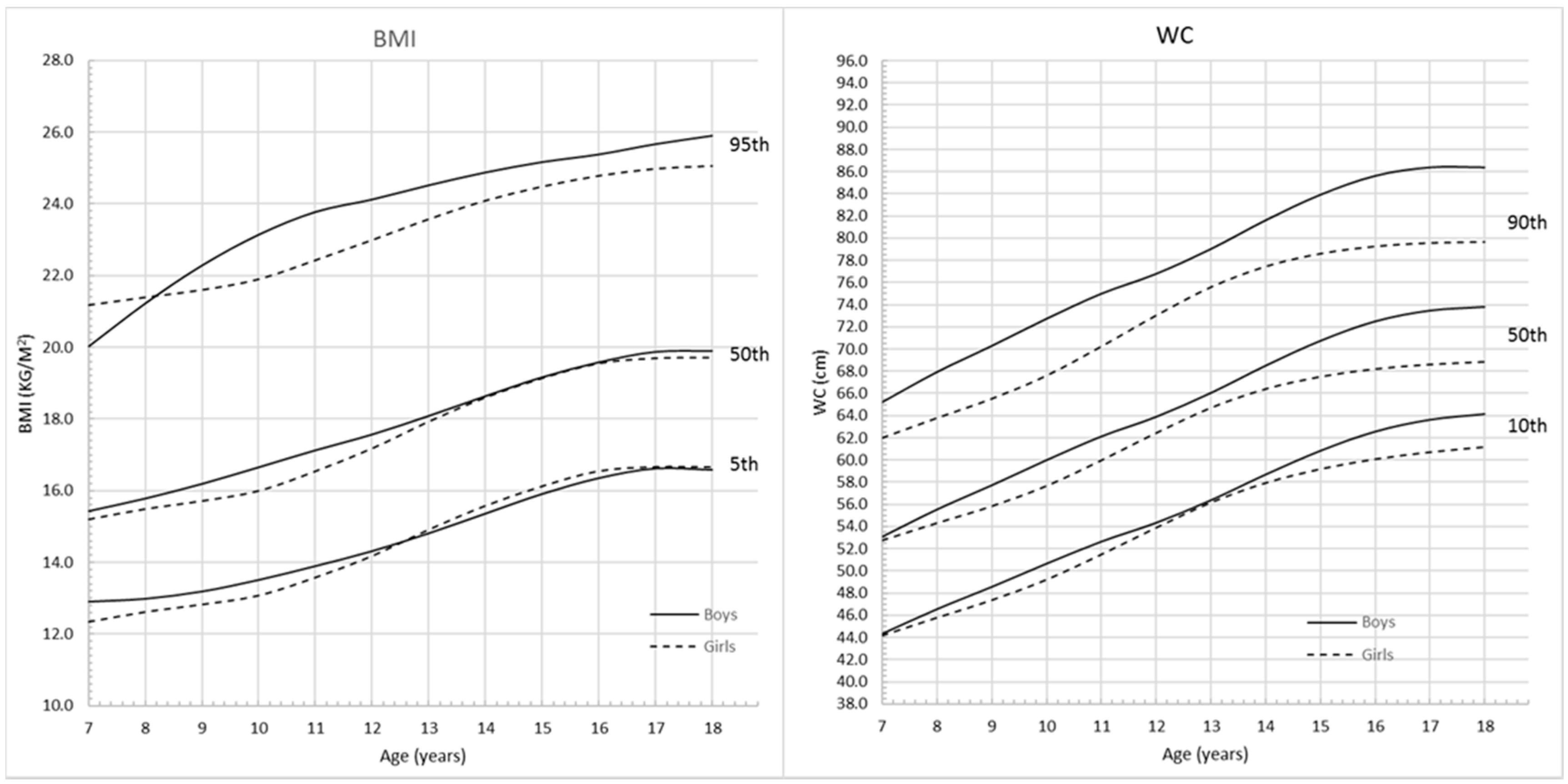 Comparison of the BMI and WC percentile curves for Chinese boys and girls aged 7–18 years.