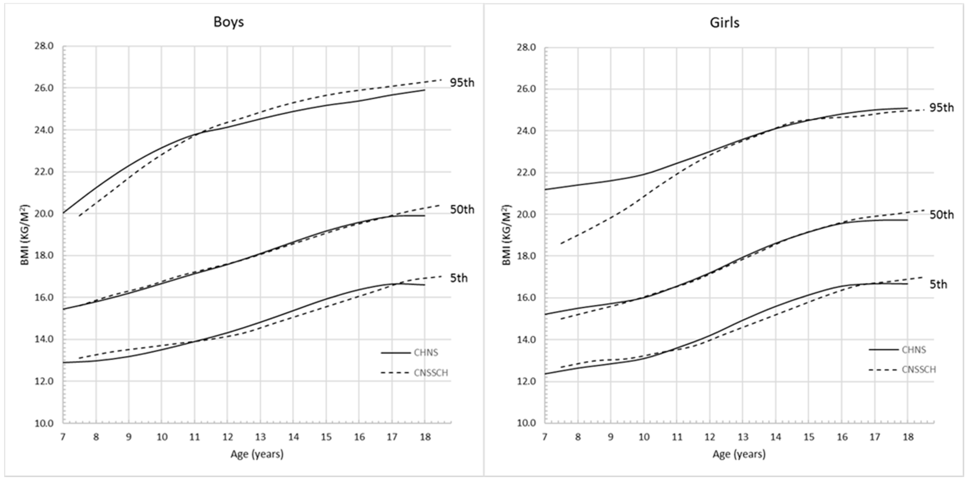 Figure 4 and Figure 5 show the comparison of the 5th, 50th and 95th percentile curves based on CHNS and CNSSCH data. For BMI (Figure 4), the CHNS and CNSSCH percentiles showed a similar shift in distribution; however, among boys, the CHNS-based percentiles started to flatten from 17 years while CNSSCH-based curves continued with increasing trend after 17 years.