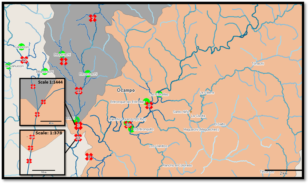 Thirteen reference locations situated near rural settlements, waterfall wells, and the belvedere used by inhabitants to collect water for drinking, cooking or washing purposes, were selected in the Bassaseachic Falls National Park, Ocampo Municipality in the state of Chihuahua, Mexico (28°07′59″N 108°15′00″W, Figure 1).