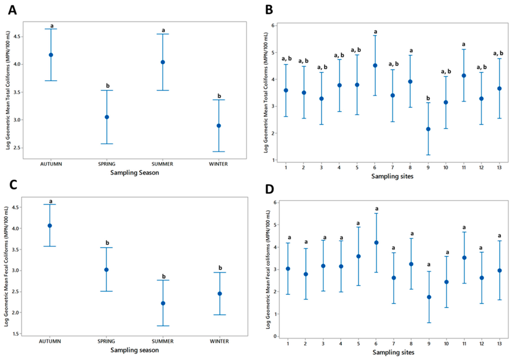 The geometric mean of the fecal coliforms significantly varied among the seasons (p < 0.001), where most of the samples collected during autumn exhibited significant differences compared with the remaining samples collected during the 2013 seasons by Tukey test (p < 0.05) (Figure 3C). Tukey test also revealed no significant differences between the fecal coliform geometric means of the sampling sites from pooled seasons (p = 0.133; Figure 3D).