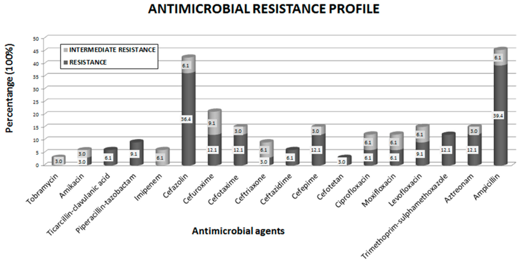 Additionally, 39.4% of isolates were resistant to ampicillin; 36.4% of isolates were resistant to cefazoline; 21.2% of isolates were resistant to ampicillin-sulbactam; 12.1% of isolates were resistant to aztreonam, cefepime, cefotaxima, cefuroxima and trimethoprim-sulfamethoxazole; 9.1% of isolates were resistant to levofloxacin and piperacillin-tazobactam; and 6.1% of isolates were resistant to ceftazidime, ciprofloxacin, moxifloxacin and ticacillin-clavulanic acid. Only 3% of isolates were resistant to amikacin, cefotetan and ceftriaxone. In the present study, Tatumella sp. did not exhibit resistance to any antibiotic tested; however, this bacterium exhibited intermediate resistance to imipenem, similar to the K. oxytoca isolate. In the present study, we identified one E. coli isolate exhibiting intermediate resistance to tobramycin (Supplementary Table S2). The antibiotic resistance profiles comparing freshwater native and enterobacterial species/biotypes collected at Basaseachi river revealed intermediate resistance in 48% (16/33) of all isolates detected in the present study (Supplementary Table S2).
