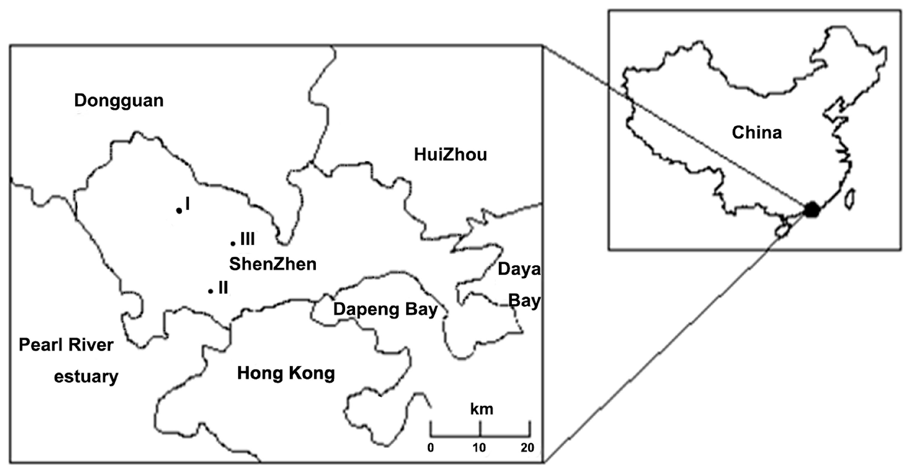 Location of the study area (I: Shi-yan Reservoir; II: Xi-keng Reservoir; III: Luo-tian Reservoir), and Shenzhen region (south of Guangdong Province).