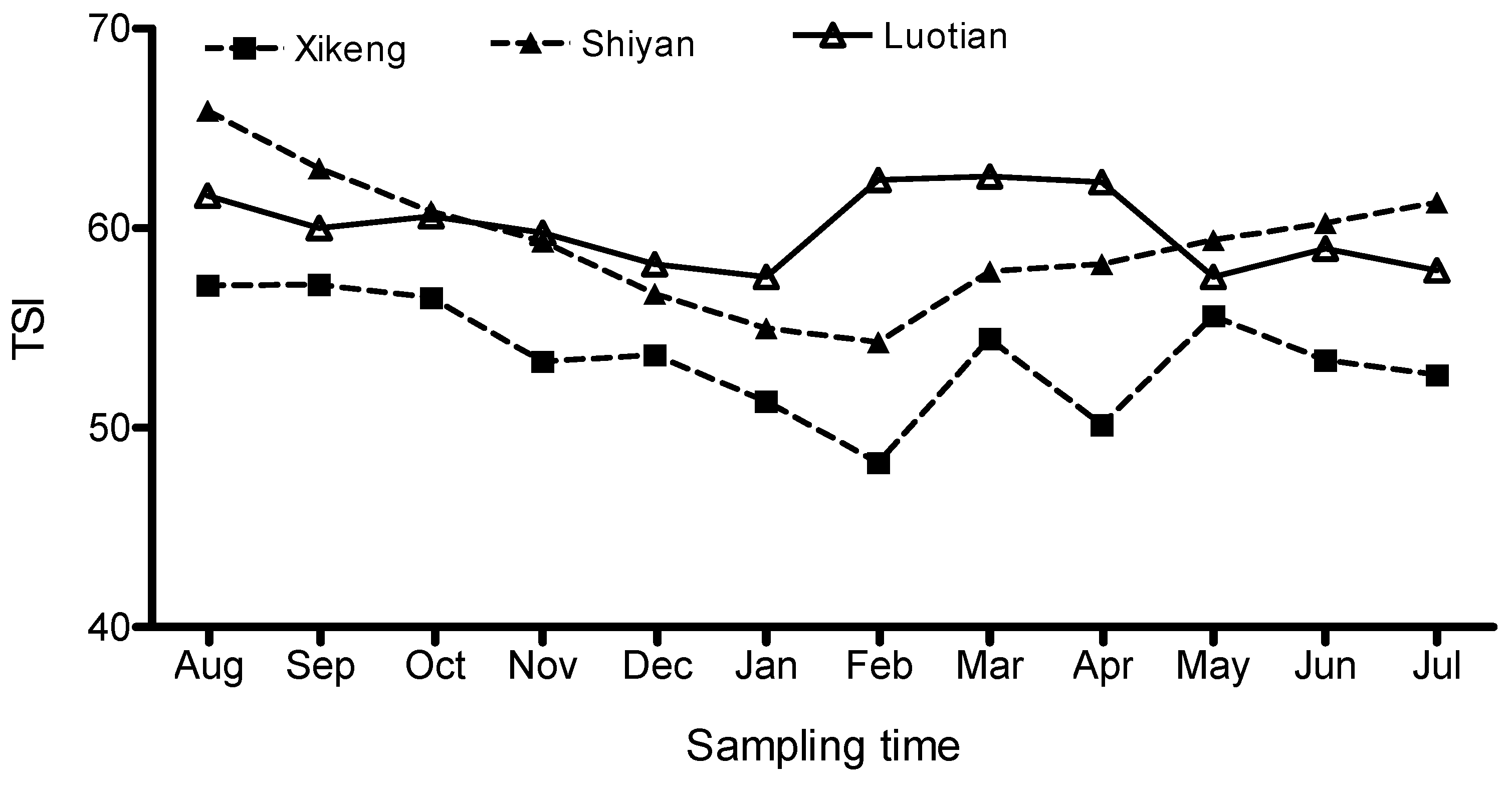 Spatial and seasonal fluctuations of the TSI of the three reservoirs are shown in Figure 2. The TSI seasonal variation of three reservoirs showed a similar trend, decreasing from August, reaching a minimum around February, and then increasing slowly again. The TSI in the hot wet months of late summer and early autumn (May to October) were generally higher than that in the mild dry months of winter and spring (November to April). However, the TSI in Luo-tian Reservoir was a bit higher than the other two in late winter and early spring (February to April). Spatially, the TSI value was similar among the three reservoirs, although it was slightly lower in Xi-keng than that in the other two reservoirs. These results indicated that trophic status was similar among the three reservoirs, and it was slightly less in the Xi-keng Reservoir than the other two.