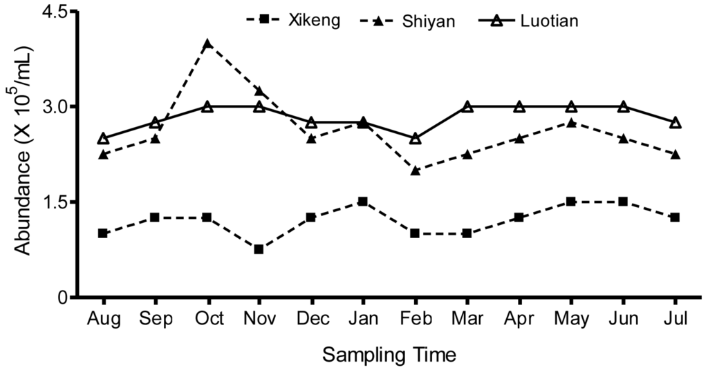 The total bacterioplankton abundance ranged from 7.5 × 104 to 4 × 105 cells/mL in the three reservoirs during the sampling period. Spatially, monthly average bacterioplankton abundances of 2.8 × 105, 2.6 × 105 and 2.1 × 104 cells/mL were observed in Luo-tian, Shi-yan, and Xi-keng Reservoir, respectively; and the abundance declined in the order from the higher to the slightly lower trophic status reservoir. Seasonally, the bacterioplankton were more abundant in October and May, while less abundance was observed in February (Figure 3). Among the three reservoirs, the range of abundance of Shi-yan displayed a dramatic shift with the seasons, and the other two were smoother.