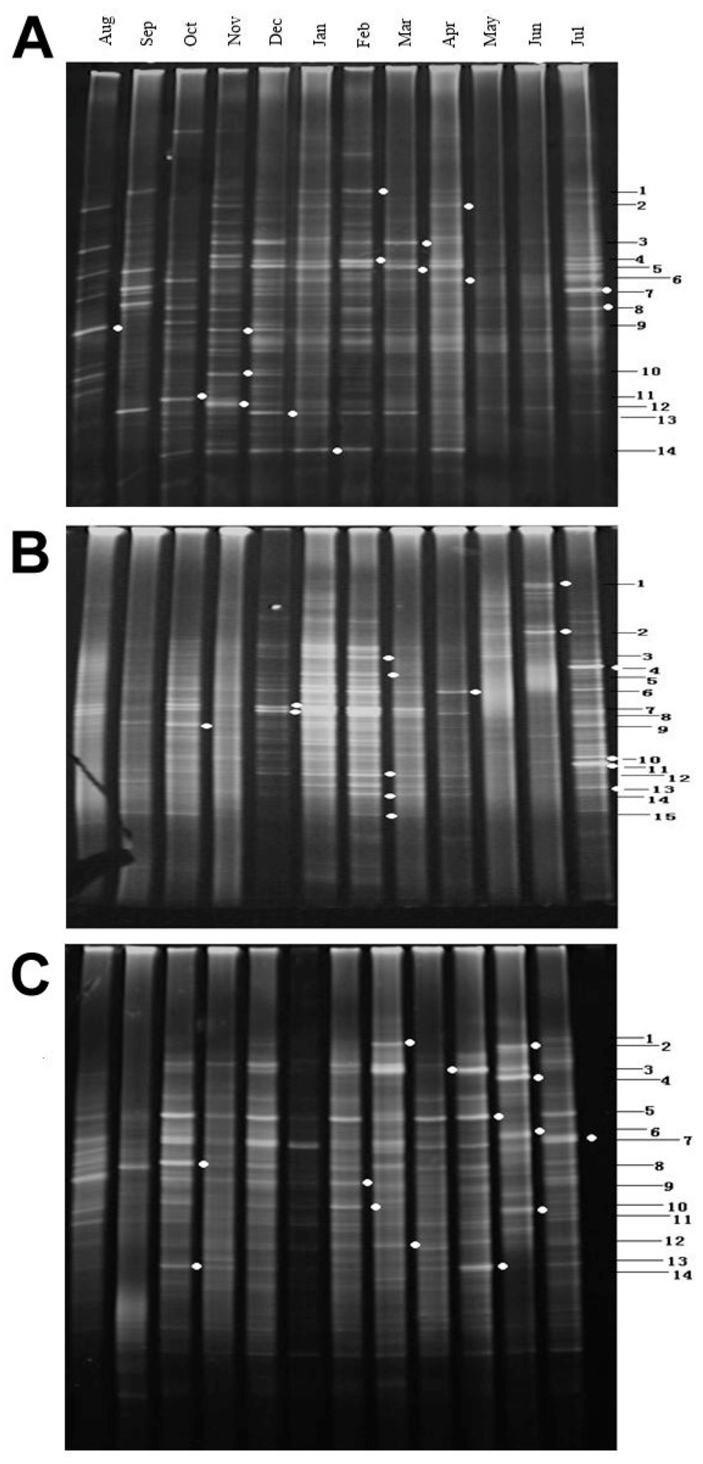 Denaturing gradient gel electrophoresis (DGGE) fingerprints of the samples from three reservoirs. Dots show the bands that were analyzed by sequencing. (A) Xi-keng Reservoir; (B) Shi-yan Reservoir; (C) Luo-tian Reservoir.