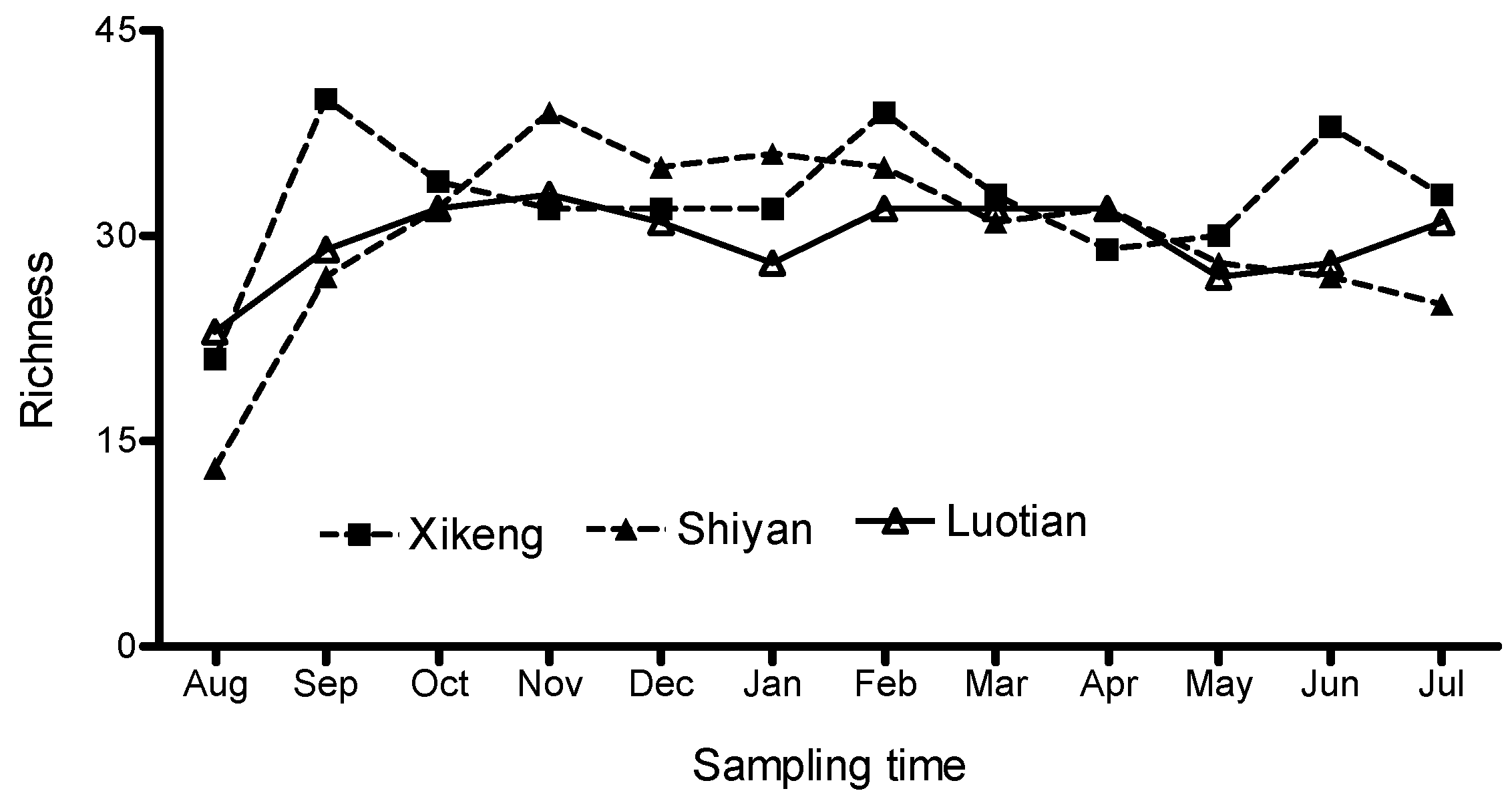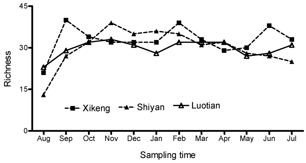 Figure 5 shows the bacterioplankton richness, which was defined as the number of DGGE bands. Spatially, although the number of bands for the individual samples varied from 13 to 40, the monthly average bacterioplankton richness did not vary greatly among reservoirs (30–33), and the richness was slightly higher in the Xi-keng Reservoir, which has slightly less trophic status than the other two reservoirs. Seasonally, the bacterioplankton richness remained relatively stable from late autumn to early spring, while it fluctuated significantly in other times, especially from August to September, with the lowest richness observed in August and then a sharp increase.