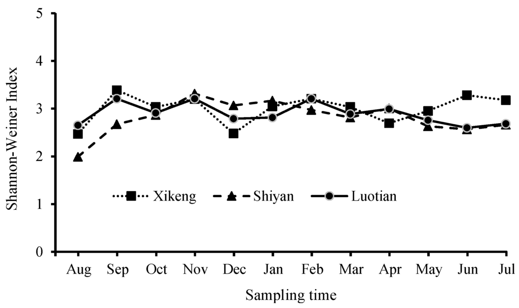 Similar to the bacterioplankton richness, the Shannon-Weiner richness index did not vary greatly among the three reservoirs (2.8–3.0) (Figure 6). Seasonally, the index remained relatively stable throughout the year, although it fluctuated in June to September of late summer and early autumn, with the lowest (2.02) and the highest (3.37) index observed in August and September/November, respectively.