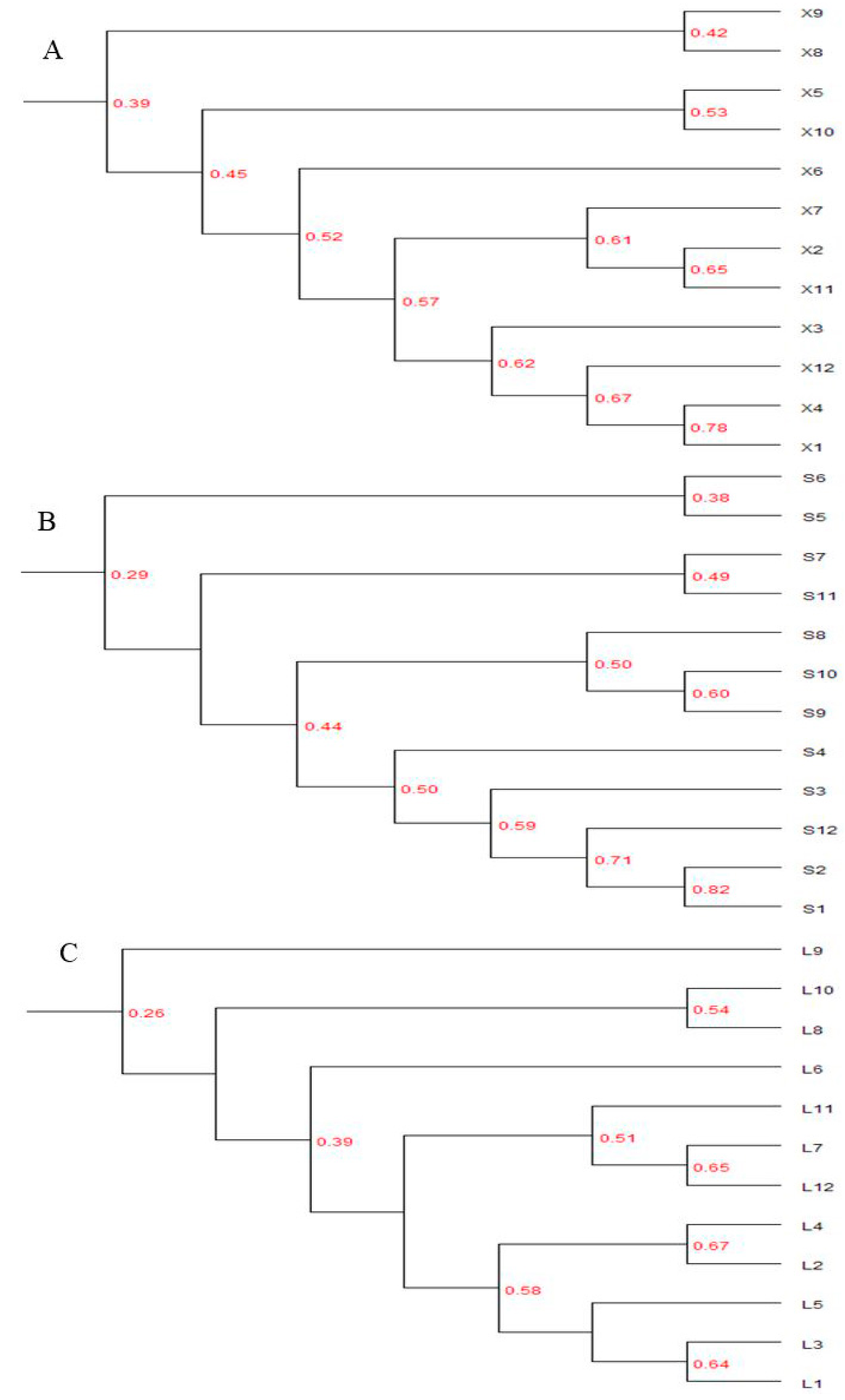 Dendrogram obtained by unweighted pair group with mathematical averages (UPGMA) clustering of DGGE patterns from three reservoirs. Similarity is expressed as the Dice correlation coefficient. (A) Xi-keng (X) Reservoir; (B) Shi-yan (S) Reservoir; (C) Luo-tian (L) Reservoir.