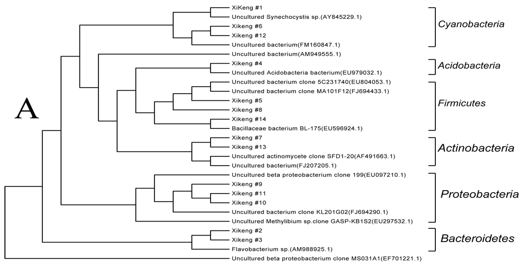 Phylogentic tree based on the excised DGGE band of three reservoirs. (A) Xi-keng Reservoir; (B) Shi-yan Reservoir; (C) Luo-tian Reservoir.