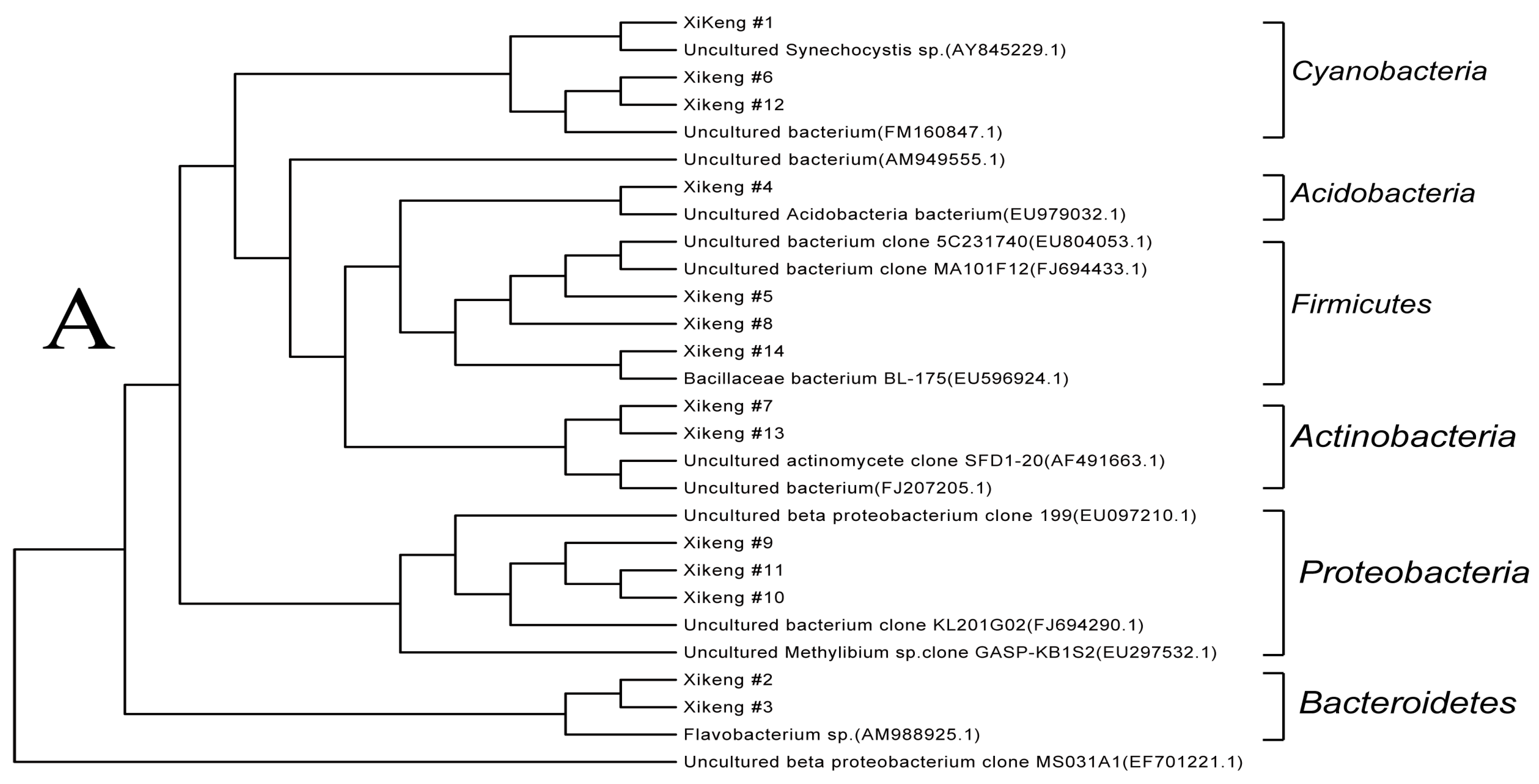 Figure 8 shows the phylogenetic relationship of the 16S rDNA-V3 sequences representing the respective excised DGGE bands in the three reservoirs. The bacterial sequences were grouped into five to seven clusters in each reservoir. The clusters are Planctomycetes, Cyanobacteria, Bacteroidetes, Firmicutes, Proteobacteria, Acidobacteria, and Actinobacteria. Obviously, the BCC was different among the three reservoirs (Table 2). Proteobacteria, Actinobacteria, Bacteroidetes, and Cyanobacteria were found in all the three reservoirs, and they constituted the majority of the bacterial community. Proteobacteria, Actinobacteria, and Bacteroidetes were most dominant in the Shi-yan Reservoir, and account for 40%, 20%, and 20% of the BCC, respectively. While for the Luo-tian Reservoir, which has almost the same trophic status as Shi-yan Reservoir, Actinobacteria and Acidobacteria were most abundant, and accounted for 28.6% and 21.4% of the BCC, respectively. Firmicutes, Cyanobacteria, and Proteobacteria were most dominant in the slightly lower trophic Xi-keng Reservoir, and accounted for 28.6%, 21.4%, and 21.4% of the BCC, respectively.