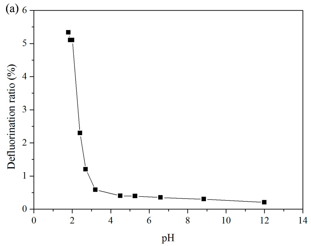 Concentrations of fluoride ion were analyzed using a Dionex-500 ion chromatography system (Dionex, Sunnyvale, CA, USA). The samples were filtered through Dionex OnGuard cartridges (1 cubic centimeter; Dionex) to reduce the interference of organic compounds before analysis. The cartridges were cleaned and conditioned with 4 mL of methanol and 10 mL of Milli-Q water before use. Fluoride analysis was carried out using an AS14A (4 mm × 250 mm) analytical column and Ionpac AG14A 4-mm guard column (4 mm × 50 mm) with a degassed 8.0 mM sodium carbonate and 1.0 mM sodium bicarbonate mobile phase at a flow rate of 1 mL·min−1. The retention time for fluoride ion was 3.12 min. In addition, a fluoride-ion-selective electrode was also used to analyze concentrations of fluoride ion, after a 1:1 dilution with an ionic strength adjustment buffer. The ionic strength adjustment buffer solutions were prepared by adding hydrochloric acid into trisodium citrate dehydrate aqueous solution (1 M) adjusting solution pH to 6.00. The quantitative detection limits were 1 μg/L and 20 μg/L, for the ion chromatography and ion selective electrode, respectively.