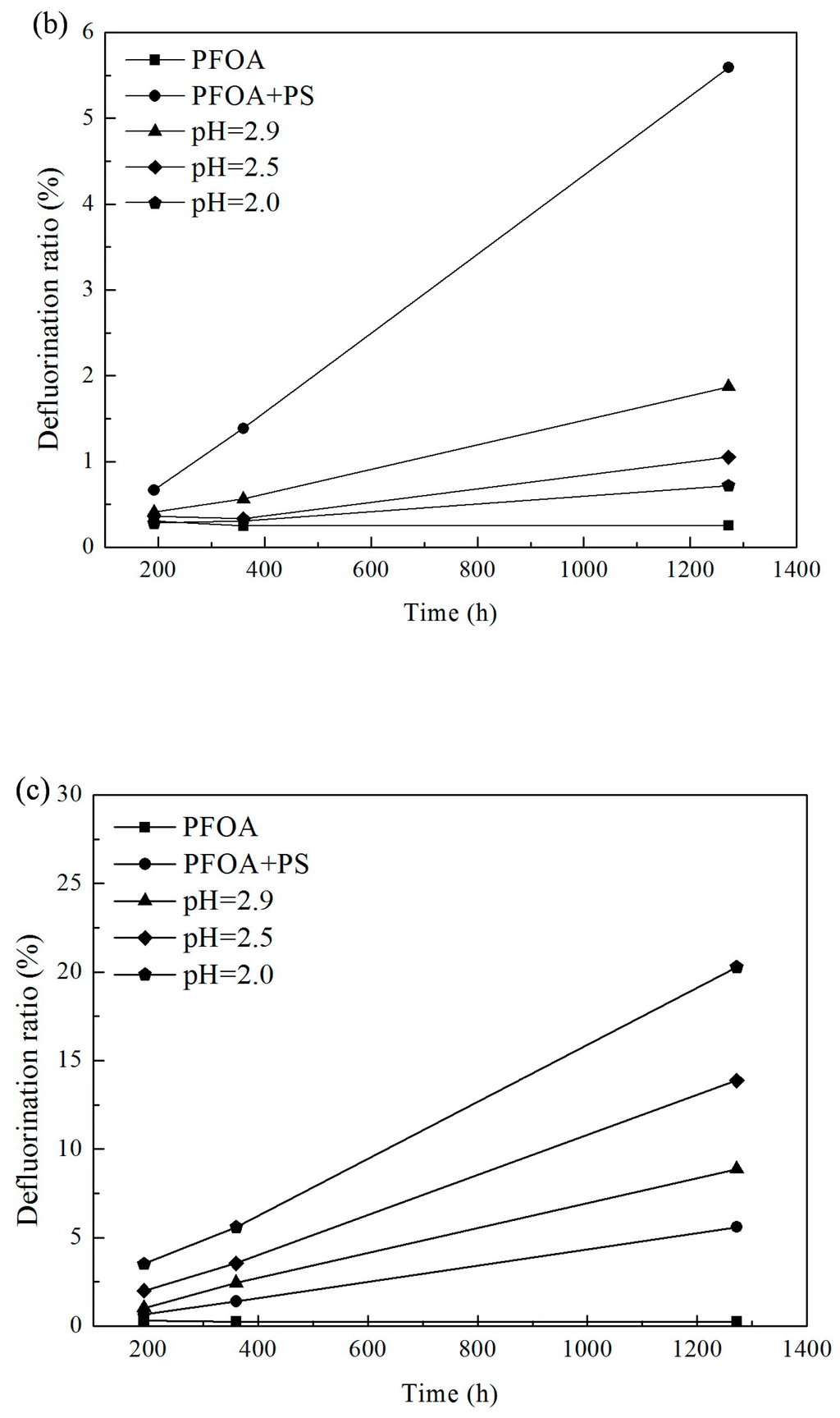 Effects of pH on the degradation of PFOA: (a) Solution pH was adjusted by NaOH and H2SO4 from 1.8 to 12.0, [PFOA]0 = 20 μM; [persulfate]0 = 2 mM, reaction temperature: 40 °C, reaction time: 22 h; (b) solution pH adjusted by HCl, room temperature (<20 °C), [PFOA]0 = 20 μM, [persulfate]0 = 2 mM; and (c) solution pH adjusted by H2SO4, reaction temperature (at room temperature < 20 °C), [PFOA]0 = 20 μM, [persulfate]0 = 2 mM. The initial pH value of 20 μM PFOA was about 5.4, and the initial pH value of 20 μM PFOA with 2 mM persulfate, without pH adjustment, was about 4.2.