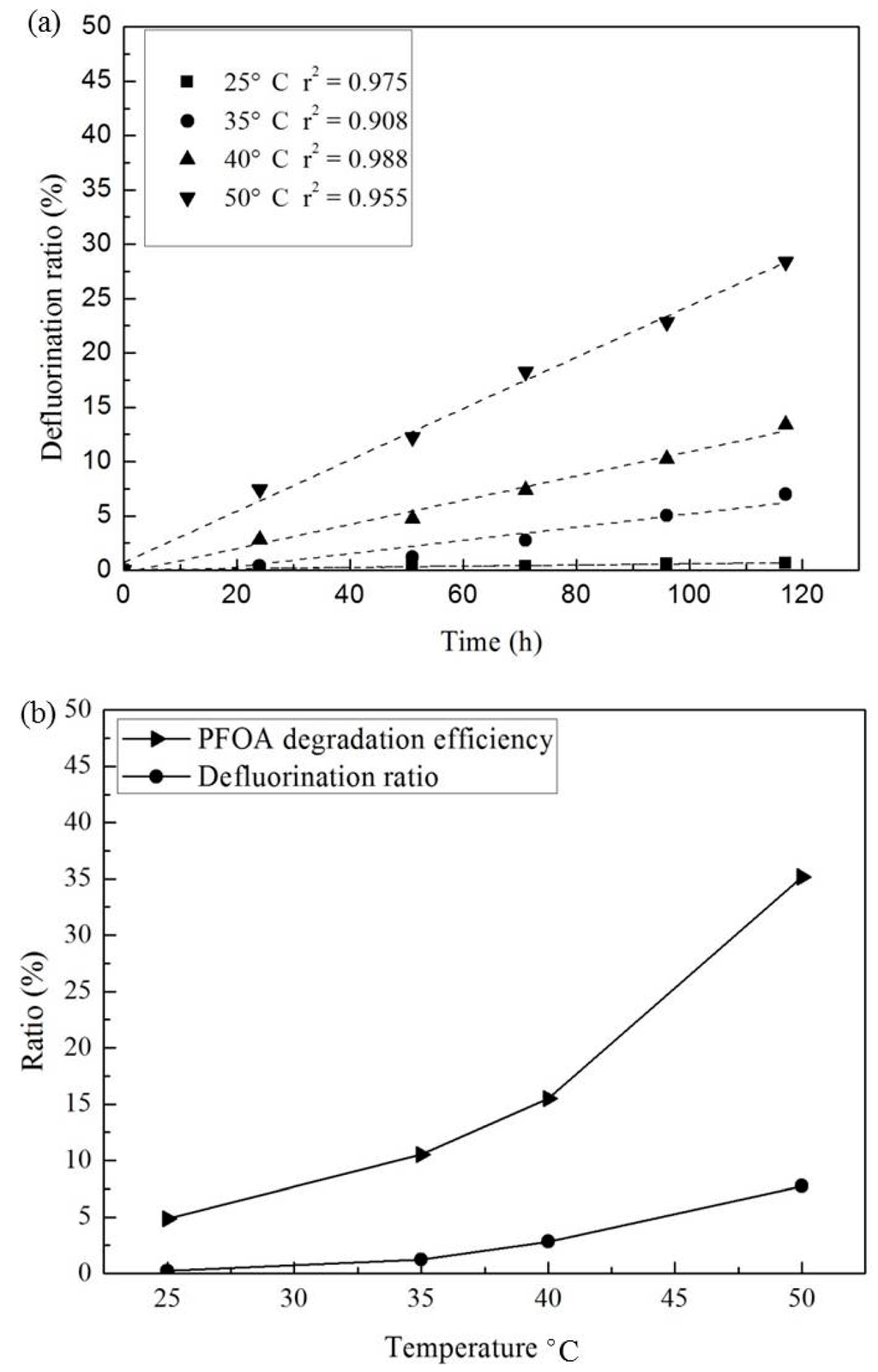 Additional experiments were conducted to evaluate the effect of temperature on PFOA degradation by activated persulfate under acidic conditions. The results are shown in Figure 3. The temperature range tested included 25 °C, 35 °C, 40 °C and 50 °C. As expected, the DF ratio increased with increasing temperature, and the incremental increase in DF ratio was more significant when temperatures were higher than 40 °C (Figure 3a). This is due to the influence of heat activation as shown in Equation (8), and is consistent with the literature which has demonstrated that heat-activation of persulfate can be achieved at temperatures above 40 °C [25]. The impact of temperature was further evaluated using the solution system with a molar ratio of PFOA to persulfate of 1:100 and with a reaction time of 24 h at 50 °C (Figure 3b). The corresponding DF ratio was 7.45%, which accounts for approximately 35.7% of the PFOA degradation efficiency. This suggests that not all PFOA degrades via fluorine removal.