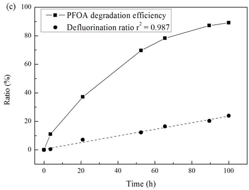 The effect of reaction time was also explored, and the results are shown in Figure 3a,c. As shown in Figure 3a, the DF ratio increased with increasing reaction time. The r2 value of the linear regression fitting of DF ratio to reaction time varied from 0.908 to 0.988, demonstrating a linear relationship between DF ratio and reaction time through the reaction period until a DF ratio of 25% was achieved. As with the effect of temperature, this observation was further verified by experiments conducted at a temperature of 50 °C (Figure 3c). Both the PFOA degradation efficiency and DF ratio increased with increasing reaction time. The DF ratio exhibited a linear relationship with reaction time, and the r2 value of the linear regression fitting was 0.987. In contrast, the PFOA degradation efficiency initially increased faster than the DF ratio, and then slowed down after a reaction time of 80 h when the degradation efficiency was up to 80%. After a reaction time of 100 h, the DF ratio was 23.9%, accounting for 89.9% of PFOA degraded. This indicates that PFOA degraded by activated persulfate does not undergo complete conversion to fluorine and carbon dioxide directly, but rather undergoes a stepwise degradation process. Even though the long reaction time makes it more difficult to implement a large-scale remediation system for PFOA removal from groundwater, this finding is very helpful for engineers who are in charge of determining the monitoring frequency to evaluate the effectiveness of PFOA remediation with activated persulfate.
