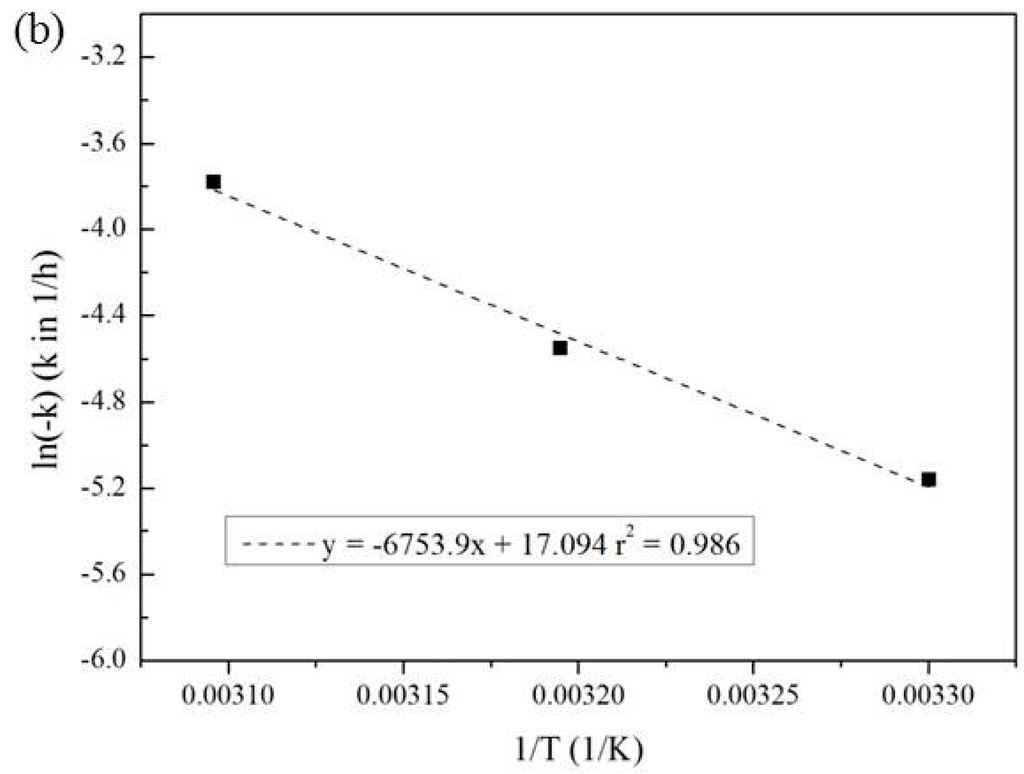 The kinetics of PFOA degradation by activated persulfate under acidic conditions are shown in Figure 4a, where PFOA concentration changes were plotted as ln(Ct/C0) versus reaction time at temperature of 30 °C, 40 °C and 50 °C. The degradation of PFOA by activated persulfate under acidic conditions was found to follow the pseudo-first-order decay model, with the r2 correlation values of 0.894, 0.988 and 0.998, for temperature of 30 °C, 40 °C and 50 °C, respectively.