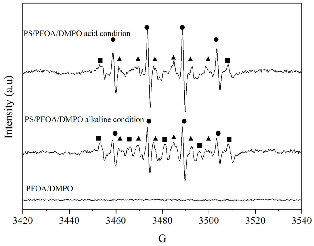 Free radical analyses, which were used to identify the effective radicals contributing to the degradation of PFOA, were conducted under three different experimental conditions: (1) PFOA only in aqueous solution as the control system; (2) PFOA with persulfate under acidic conditions; and (3) PFOA with persulfate under alkaline conditions. In the control system, 25 mL of PFOA at a concentration of 20 μM was added to the 40-mL borate glass bottles at a temperature of 50 °C. The solution pH was not adjusted and the final pH was 4.2. For experiments under acidic conditions and alkaline conditions, 20 μM PFOA and 2 mM persulfate were mixed to react at a temperature of 50 °C, with their solution pH adjusted by H2SO4 to 2.0 and NaOH to 12, respectively. After a reaction time of 10 min, an appropriate amount of DMPO (i.e., that would result in a final concentration of 100 mM DMPO in the system), dissolved in phosphate buffer at pH 7.4, was added immediately to react with free radicals produced by persulfate. 20 μL of the mixed solution were then loaded in the quartz capillary tube of EPR for analysis.