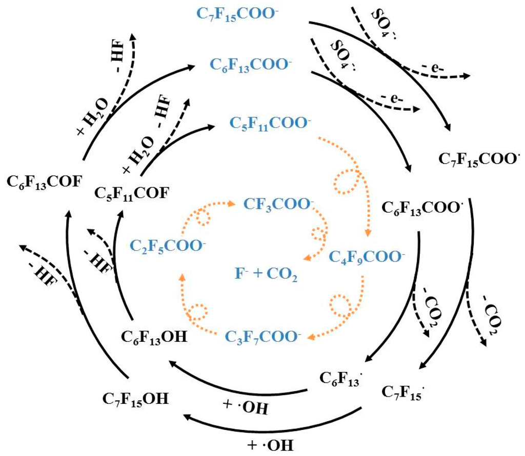 Considering the free radical and degradation byproduct analyses discussed above, together with the mechanisms of PFOA degradation reported previously [47,48], a possible chemical reaction pathway for PFOA oxidation by activated persulfate under acidic conditions can be described by Equation (12) through Equation (16) below and is shown in Figure 6. As a first step, one electron is transferred from PFOA to reactive radical SO4−• to initiate a decarboxylation reaction and perfluoroalkyl radicals are formed (i.e., CnF2n+1•). The newly formed CnF2n+1• continues to react with •OH to form CnF2n+1OH, which undergoes an HF elimination to form Cn−1F2n−1COF [49], resulting in the formation of one-CF2-unit-shortened PFCA (Cn−1F2n−1COOH) via hydrolysis [50]. The decarboxylation and HF elimination processes continue until all PFCAs are converted to CO2 and fluoride (Figure 6).