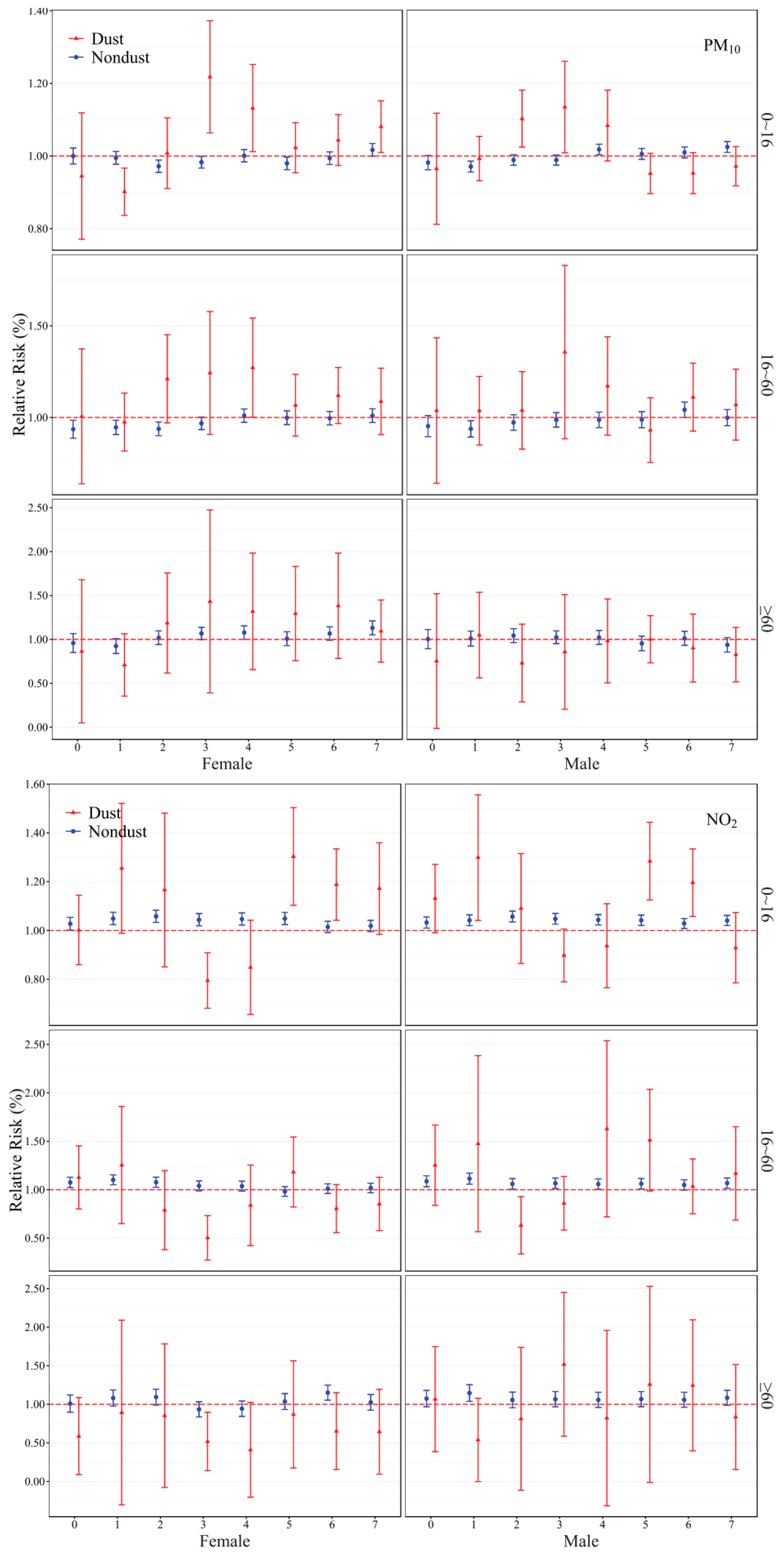| Models/PM10 | RR (95% CI) | p | SO2 | RR (95% CI) | p | NO2 | RR (95% CI) | p |
