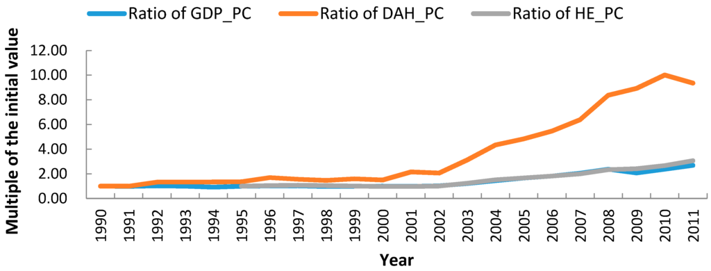In 2011, the average GDP per capita in Sub-Saharan Africa was 3076 United States dollars, substantially up from the average value of 1145 U.S. dollars in 1990 (adjusted to 2011 U.S. dollars by purchase power parity). DAH per capita in Africa grew from 1.00 to 9.37 U.S. dollars during that period, representing a much faster increase than the per capita GDP. Figure 1 showed the growth curves of these indicators as compared with initial values. The growth of these indicators notably accelerated after 2000. Moreover, DAH per capita grew faster than that of GDP per capita and heath expenditure per capita, while the latter two indictors had a similar rate of growth. This outcome implied that external health aid outpaced domestic health investment, especially after 2000.