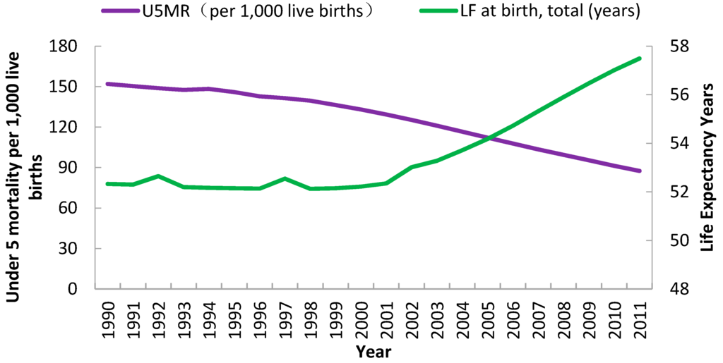 U5MR in Sub-Saharan Africa trended downward from 151.97/1000 live births for 1990 to 87.54/1000 live births for 2011, representing about a decrease of 40% from the initial value (Figure 2). The first 10% decrease occurred from 1990 to 1999, and the decrease accelerated after 2000. Life expectancy at birth grew from 52.73 years in 1990 to 57.49 years in 2011. The absolute value of this indicator had no consistent increase until 2000. After that, LE in Africa showed a consistent upward trend (Figure 2).