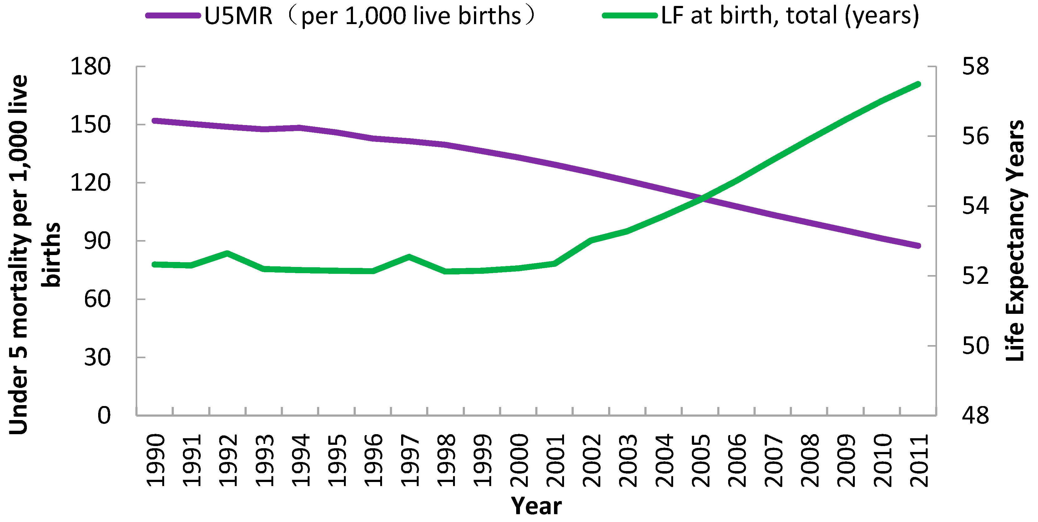 Analysis of trends for U5MR and LE in Sub-Saharan Africa, 1990 to 2011. U5MR relates to purple graphing line and corresponds to the left-hand Y-axis, while LE relates to green graphing line and corresponds to the right-hand Y-axis.
